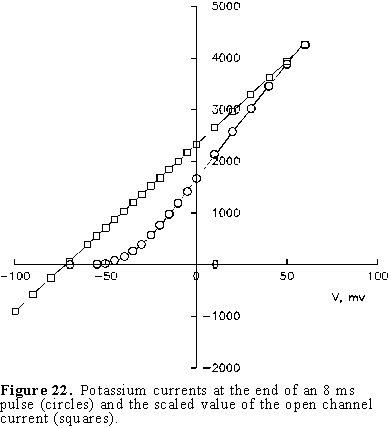 The Potassium current. We will start by exchanging all sodium ions on both sides of the membrane with the cation choline. This ion was found to be impermeant by Hodgkin and Katz and by Hodgkin and Huxley. In addition we will add a toxin called tetrodotoxin (TTX) which was found to block the sodium conductance. Under these conditions if we perform a voltage clamp experiment as described above, the currents are quite different (see Fig. 21). All the inward components as well as the early outward current have disappeared. The general characteristics of these currents are that they become larger and faster as the depolarization is increased and that they are absent for hyperpolarizing pulses. This is exactly what we found when we averaged many single K channel recordings at several potentials (see Figs. 10, 11 and 12). As expected, the current is outward with depolarization because the internal concentration of potassium is about 40 times the concentration of potassium outside. We can characterize this current by plotting the current at the end of the pulse as a function of the membrane potential during the pulse as shown by the open circles in Fig. 22. where it is clearly seen that the I vs. V relation is very non-linear for depolarizing pulses and practically zero for hyperpolarizing potentials. The open squares in Fig. 22 corresponds to the open channel characteristics scaled by the number of channels, and as expected, it is linear and crosses the axis at the potassium reversal potential (see Fig. 13).