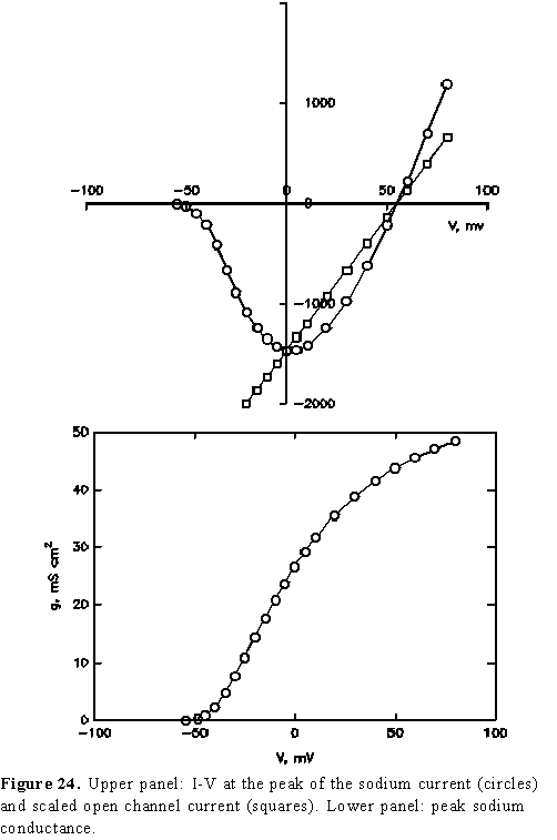 The bottom panel of Fig. 24 is a plot of the peak conductance as a function of membrane potential and it shows the typical sigmoid relation as it was seen for the K channel. This plot was obtained by dividing the peak current by V-ENa. (The reader may verify that it can also be obtained by dividing the peak current by the scaled open channel current).