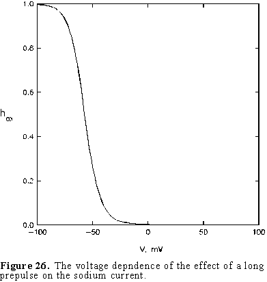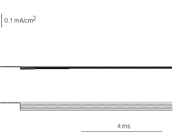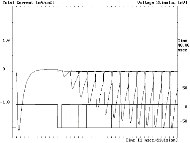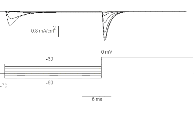 Recovery from inactivation. A depolarization opens Na channels and, if maintained, these channels inactivate. A valid question is, how long do we have to wait for the channels to be ready to conduct again? First, it is clear that if the depolarization is maintained, the channel will not conduct because inactivation will persist. We must repolarize the membrane to reset the initial conditions. Fig. 27 shows an experiment to explore the recovery from inactivation. The membrane was pulsed to 0 mV for 10 ms producing an inward Na current. Then the membrane was repolarized back to -70 mV for a variable period of time before pulsing again to 0 mV for a period of 2 ms. The figure shows all the trials superimposed with different recovery intervals at -70 mV. When the recovery interval was 1 ms, the Na current was very small (about a tenth of the current elicited by the first pulse). As the recovery time at -70 mV was prolonged, the peak inward Na current started to increase, reaching half of its original amplitude at about 7 ms and almost fully recovered at about 27 ms (the rightmost current trace shown in the Fig. 27). These results show us that to get all the Na current back we have to return the membrane to its resting value for a period of at least 10 ms. This will have important consequences in the recovery from the refractory period in the action potential.