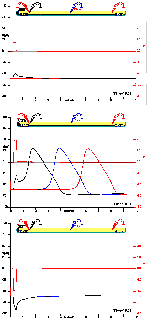 Figure 16. The response in three different locations of the axon to a variable stimulus at x=0. Top panel: stimulus= 4uA, middle panel: stimulus=10 uA, bottom panel: stimulus=-10 uA.