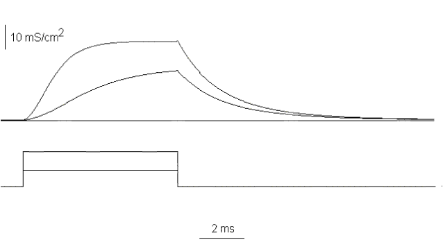 iii) the development of the conductance is sigmoid, that is, it shows a lag before turning on and upon repolarization it turns off without appreciable lag. These features are compatible with a high order process with multiple steps during turning on and a first order process in turning off.