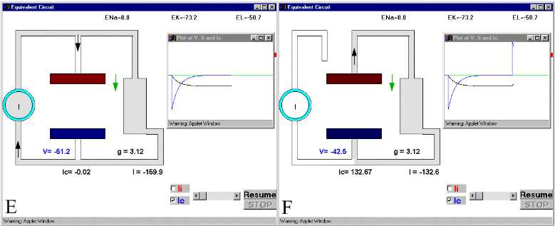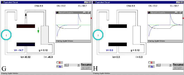 In Fig 28B, we see how initially the current is going mainly into the capacitative branch with almost no current through resistive branch. (The downward spike in the plot corresponds to the capacitive current, which is negative because it is inward). It is clear that at very short times, most of the current supplied by the current generator will go into the capacitative branch because the capacitor was discharged, while the resistive branch will receive much less current.. Parts C and D and E of Fig. 28 show the current and voltage as time progresses. Notice that as the capacitive current subsides, the voltage builds up. At long times (part E), the capacitor has reached its full charge, V has leveled off to its maximum negative value, and consequently Ic becomes zero (Fig. 28 E). If at this point we open the switch, which is equivalent to stopping the current stimulus, then the capacitor will discharge through the resistor and the current in the capacitor branch will flow in the opposite direction. At short times the capacitive current will be very large because V is changing (Fig. 28F) and a large upward current spike reflects the discharging of the capacitor branch. As time goes on (Fig 28G and H) it will subside because all the charge has been redistributed and the energy has been dissipated as heat as the current circulates through the resistor.